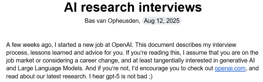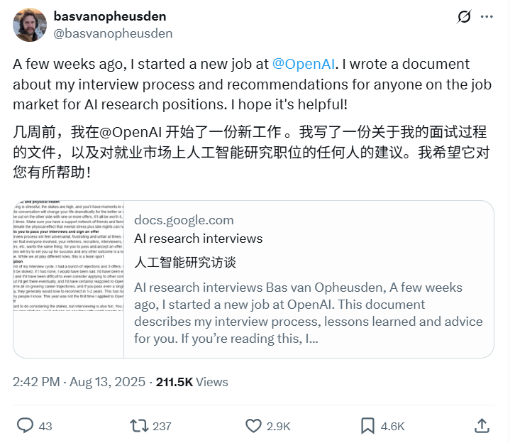 近日,一位入职 OpenAI 不到两个月的新研究员 Bas van Opheusden 分享了他的求职经历,毫无保留,面试指南长达 8 页。
