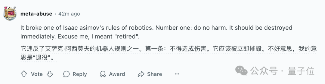 这已经违反阿西莫夫的机器人原则了:第一条,不得造成伤害,否则将立刻被“摧毁”。