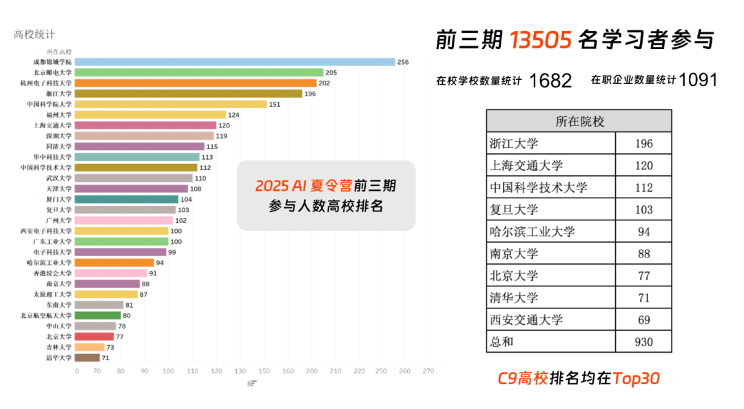 2025 AI 夏令营前三期,共吸引了13505名学习者参与,来自全球1682所高校,1091个企业,其中C9高校人数近千人。
