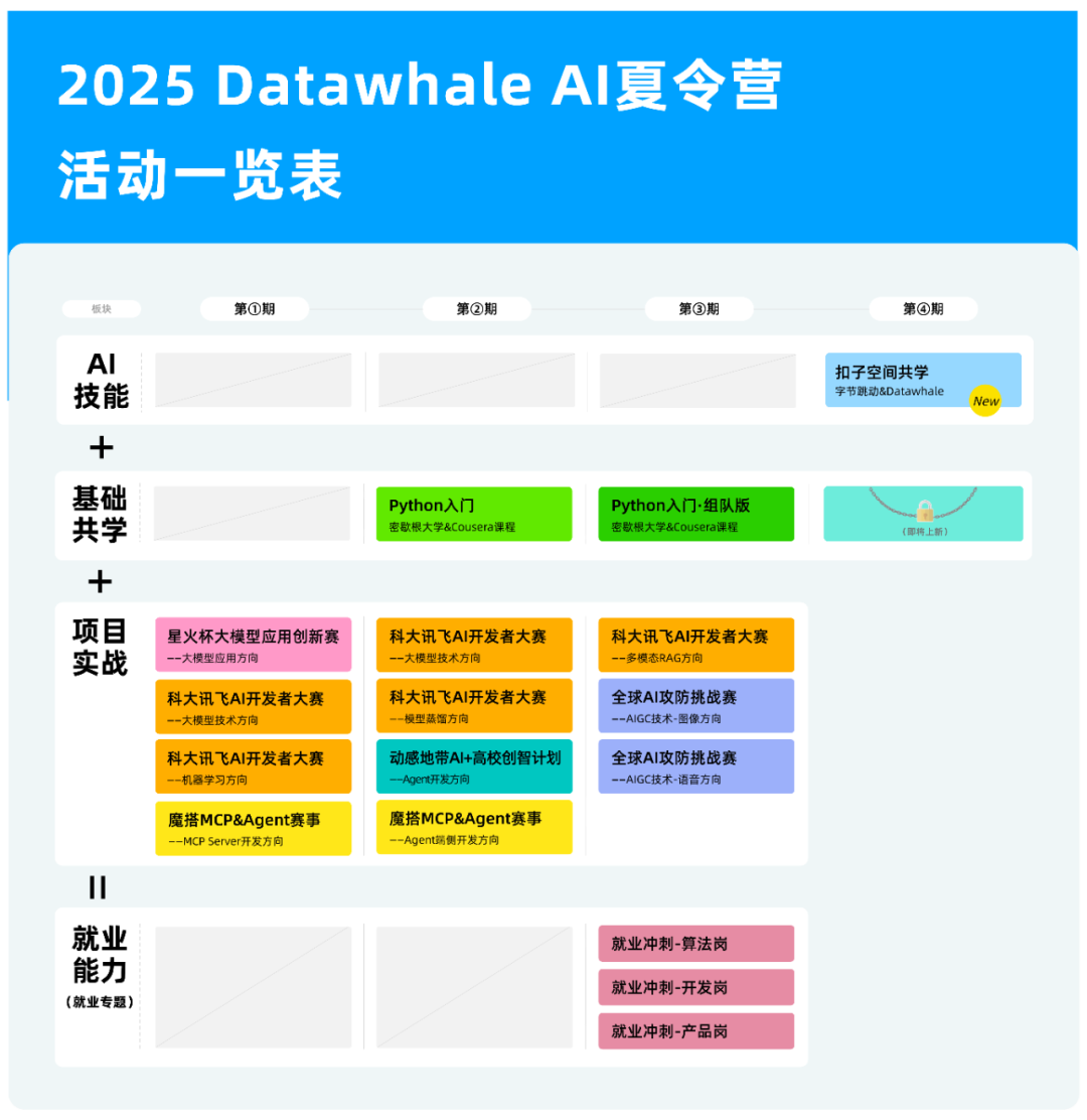 在这个夏天,AI夏令营共上线了18个学习活动,是国内规模最大、活动最丰富的AI夏令营,分为AI技能、基础共学、项目实战和就业专题四个板块。