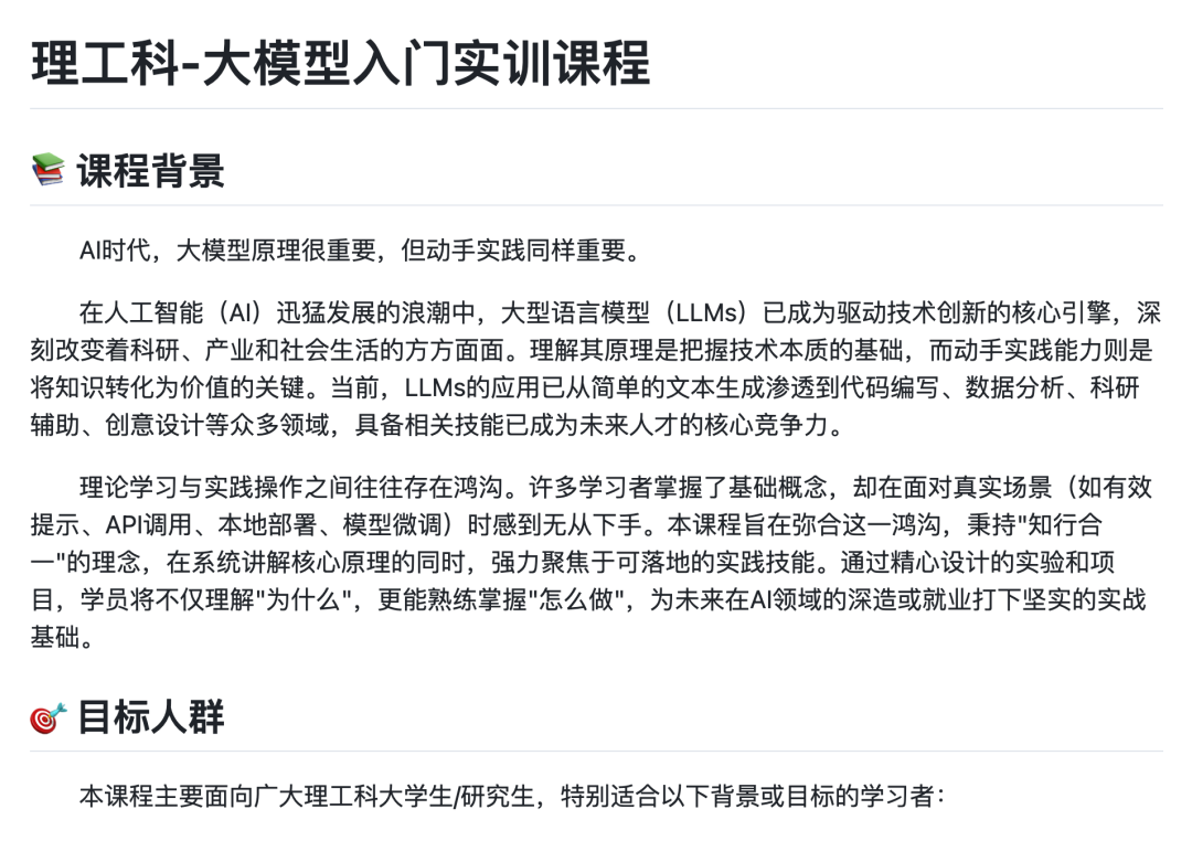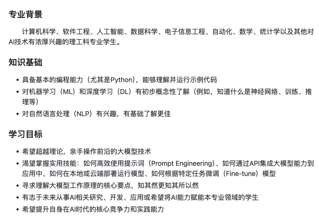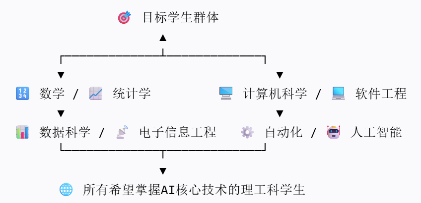 本次学习主要面向广大理工科大学生、研究生和参与教学的高校老师,特别适合以下背景或目标的学习者:计算机科学、软件工程、人工智能、数据科学、电子信息工程、自动化、数学、统计学以及其他对AI技术有浓厚兴趣的理工科专业学生。