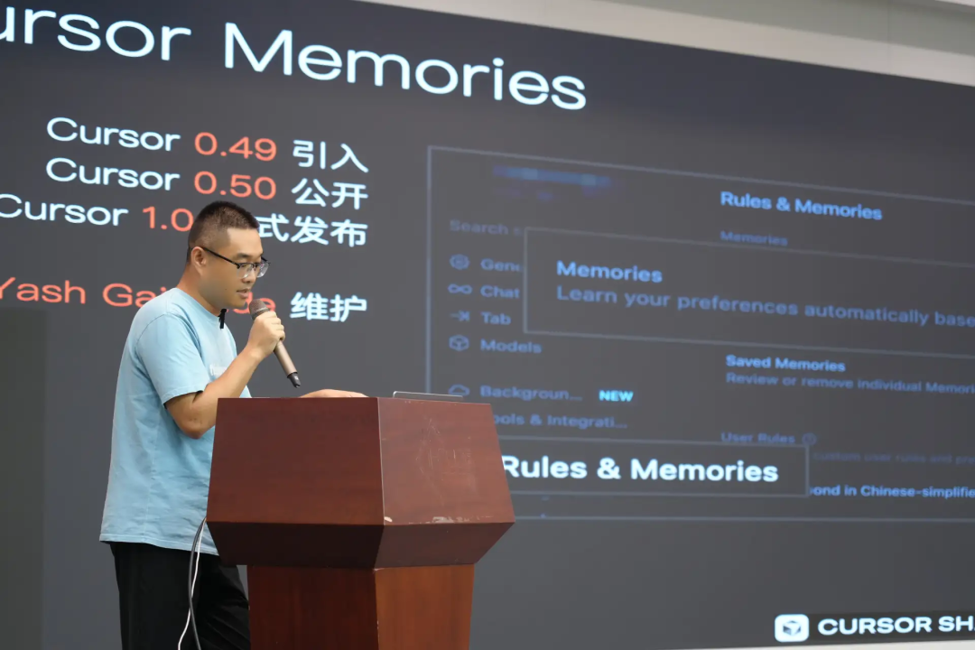 好记星是资深前端人,曾在盛大、百度、趣头条和得物担任关键岗位,后来带团队做过增长方向的前端负责人。也因为有这种跨团队、跨业务的背景,他对“工具如何真正融入日常开发”有很深的敏感度。他首先回顾了 Cursor Memories 的发展,从 0.49 版本引入、0.50 公开,再到 1.0 正式发布,并点出它的核心设计:通过云端知识库,把公共知识与项目知识库绑定在账号下,再以记忆 ID 进行调用。记忆生成有两种路径,一是用户主动要求 Cursor 记住,比如“记住我所有命令行操作都用 pnpm”;另一种是后台运行的 AI 自动提取并推送审核,形成 User Generated Memory 和 AI Generated Memory 两套机制。