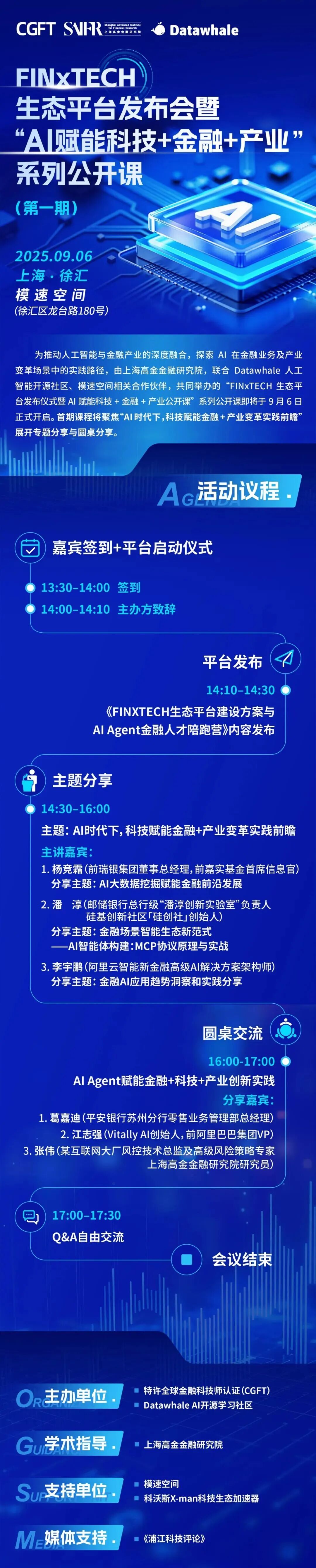 9月6日,FINxTECH生态平台发布会暨系列公开课重磅开启!特邀众多一线大咖,分享AI大数据挖掘、AI智能体构建、AI+金融应用实践等硬核内容。聚焦实战,落地为王。无论你是技术极客还是金融从业者,这期公开课都将为你打开AI赋能金融的新视野。