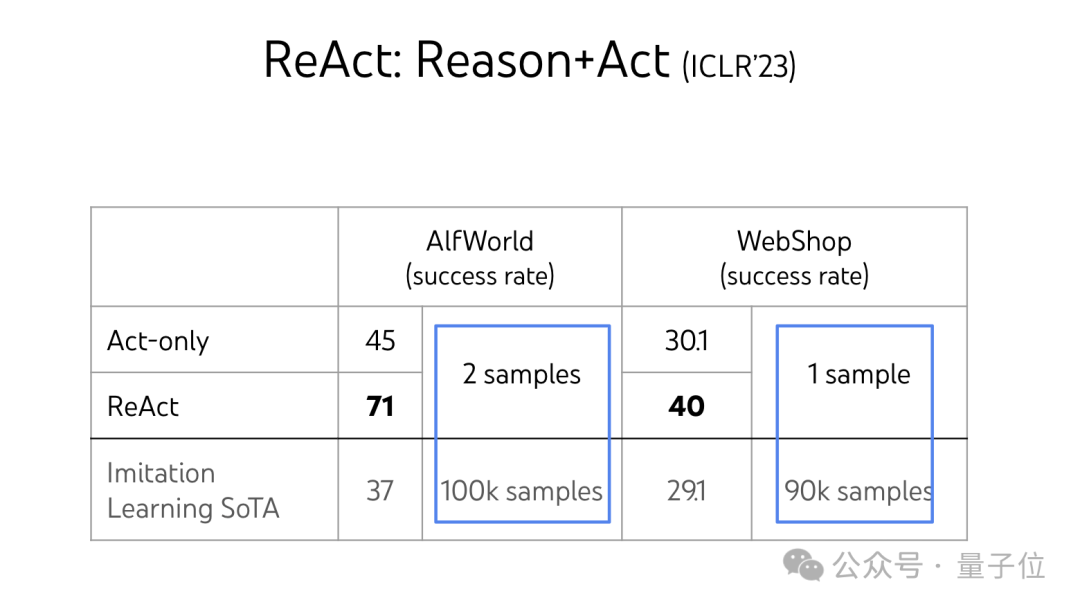 在受到GPT-3.5的启发后,姚顺雨就做了ReAct(ReAct: Synergizing Reasoning and Acting in Language Models),让大语言模型在与外部环境交互时,同时进行“推理”和“行动”。