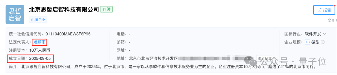 还有一家全新的创业公司刚刚被注册,法人代表正是“姚顺雨”——