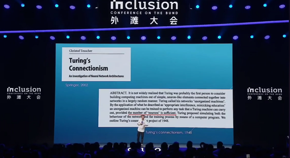 即使8年以后,Hinton在7月上海的世界人工智能大会上,重复了八年前讲的两句话,这是有原因的。以生物学作为思想的驱动,不是从AI开始的。图灵在40年代末就第一次提出了一个基本观点:今天所有神经元基础的东西都有一个名字,叫连接(connection)。