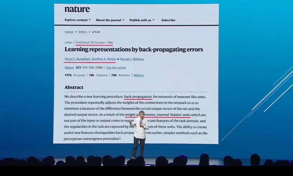 很久之前就有人在探索这件事情。这篇文章发表在1986年的《自然》杂志上,非常明确地讲到了权重在模型中的重要性。第三作者是Hinton,前两个作者是当时世界上最著名的心理学家。