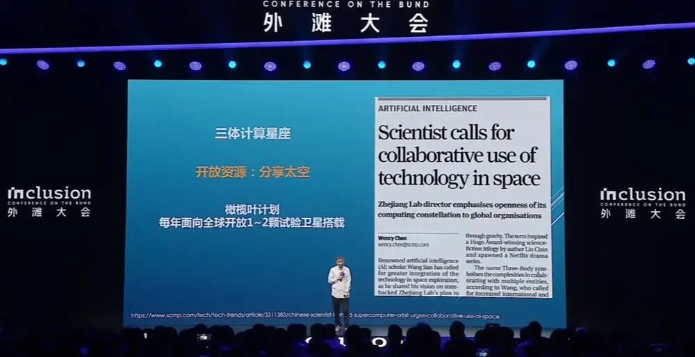 “三体计算星座”就是希望大家共同完成这个星座,共同分享这个太空。《南华早报》听过我的演讲后写过一篇文章,本质上就是:只有这样,我们才能分享太空,把AI送入太空。