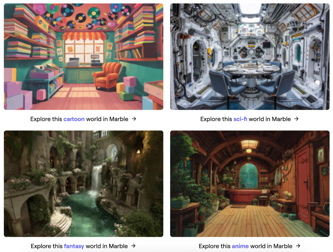 无论是输入一张图片还是一段文字提示,Marble 都能生成一个 3D 世界,供你无限制地探索 —— 没有时间限制、没有形变、没有不一致性。