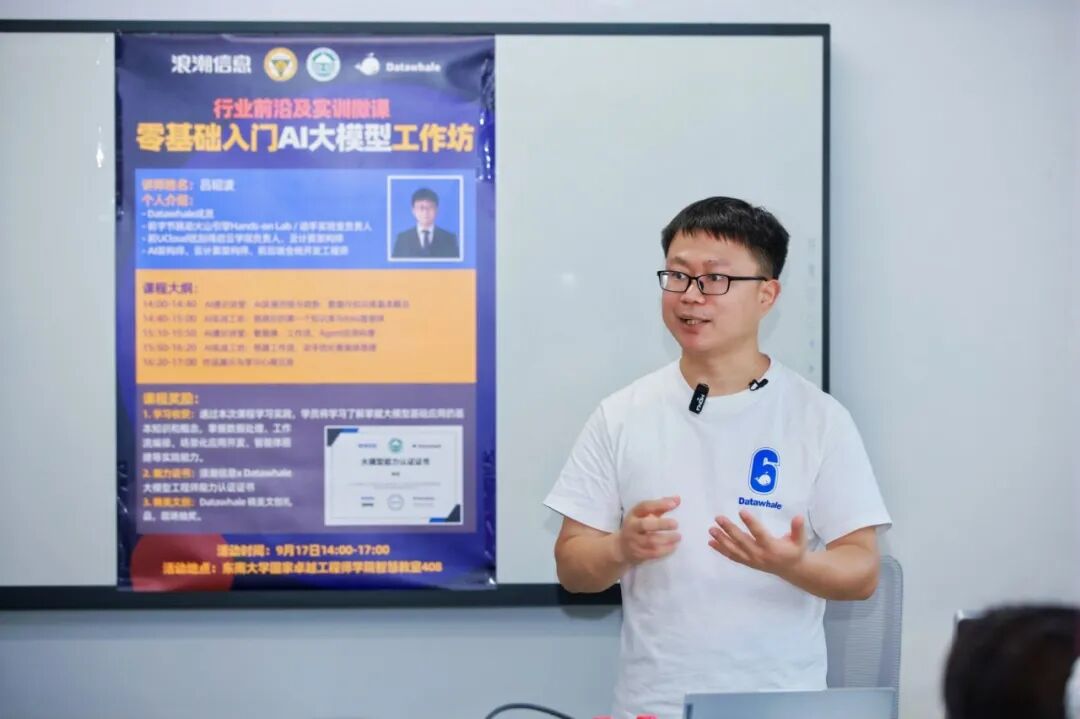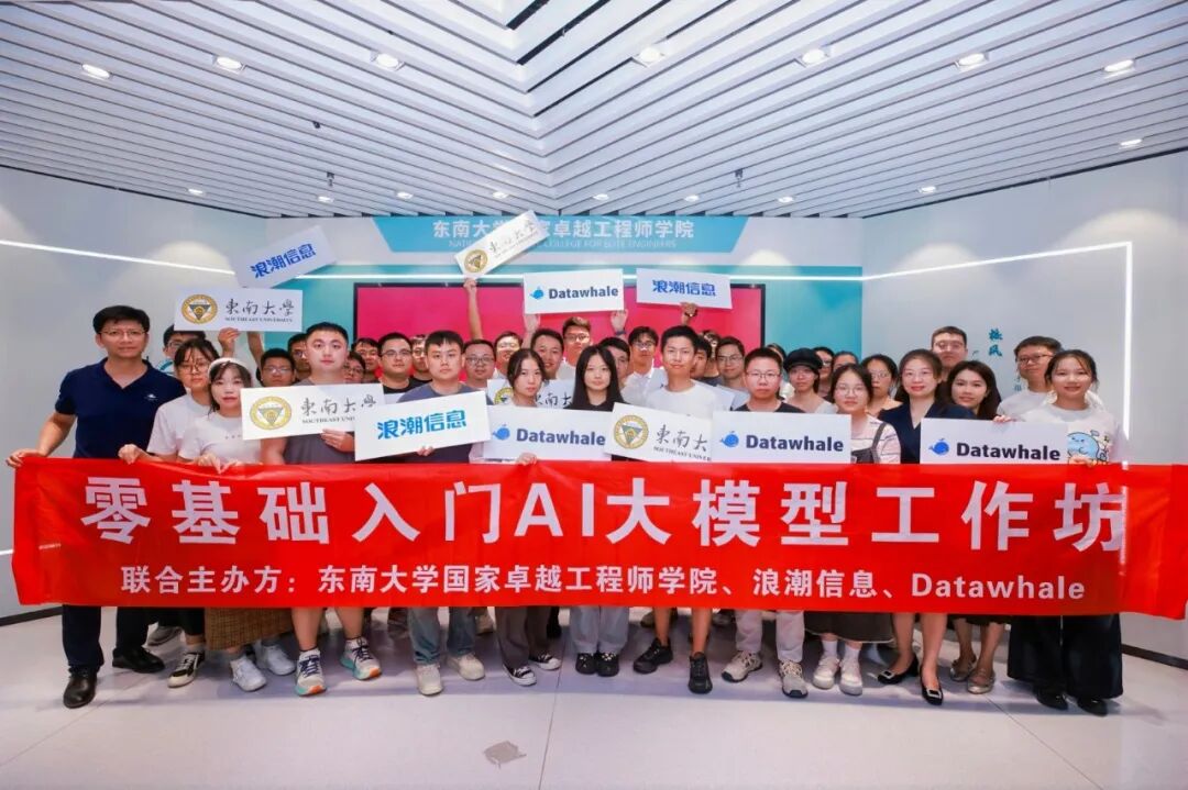 9 月 17 日,由 东南大学国家卓越工程师学院、浪潮信息、Datawhale 开源学习社区三方联合主办 的 “零基础入门 AI 大模型工作坊 —— 东南大学专场” 圆满落幕。本次活动以 “理论 + 实操” 双轨模式,为现场同学搭建了从 AI 认知到实战应用的桥梁,吸引众多卓越工程师学院的硕博同学参与,共同探索人工智能的无限可能。