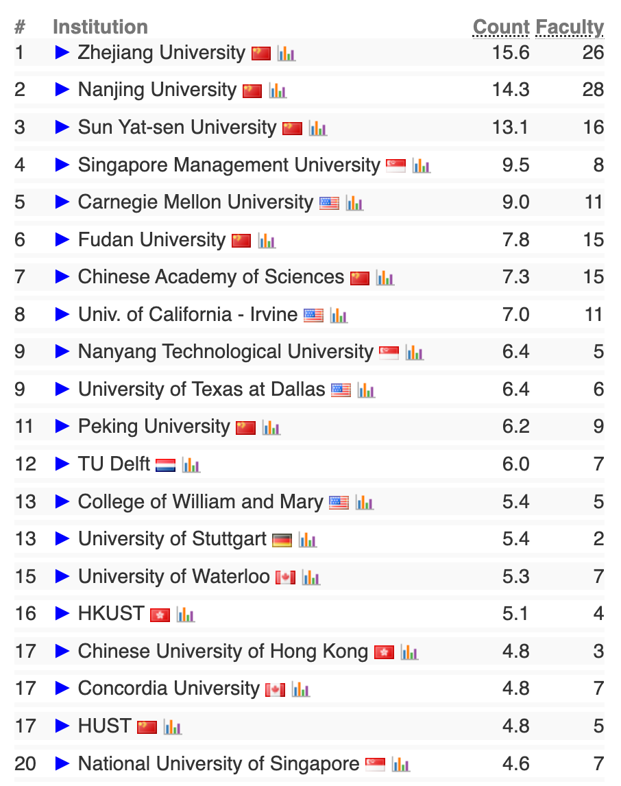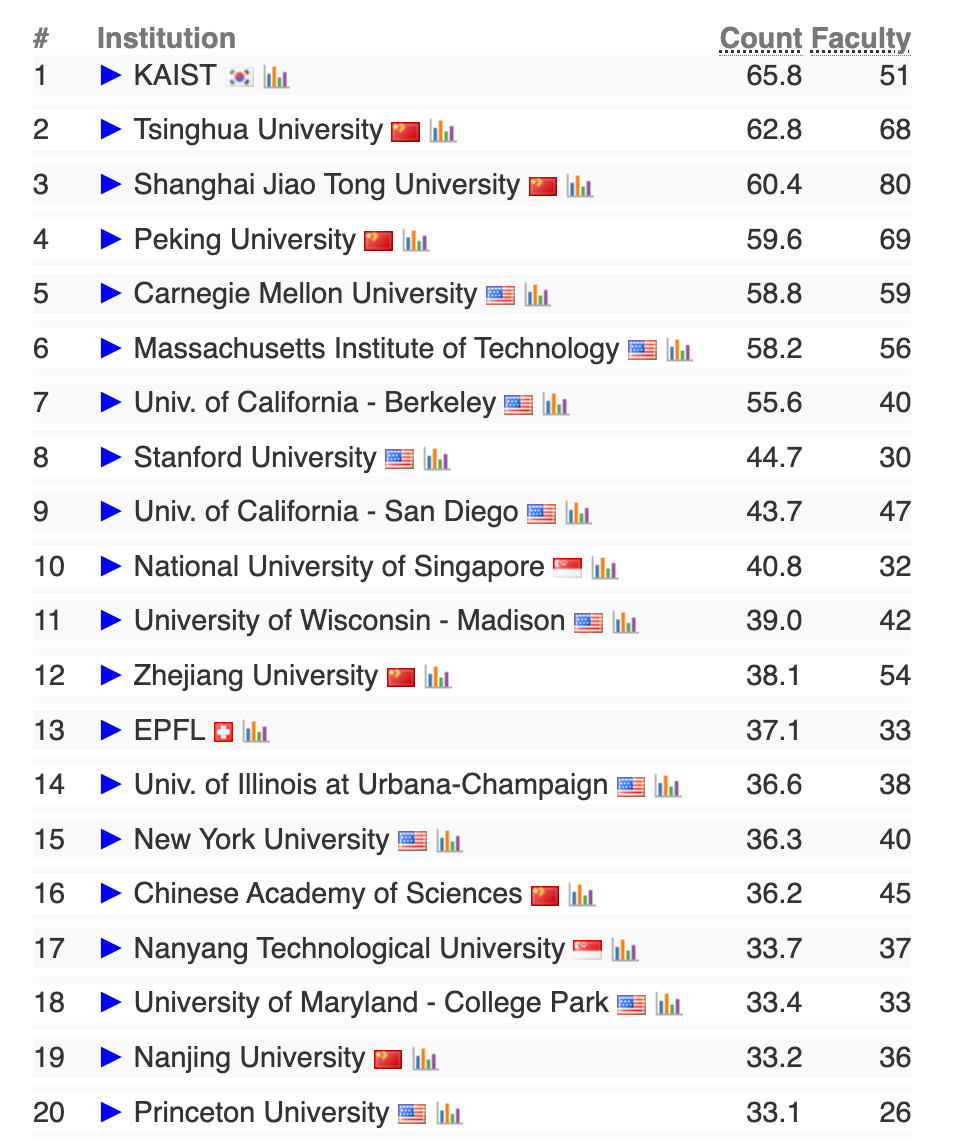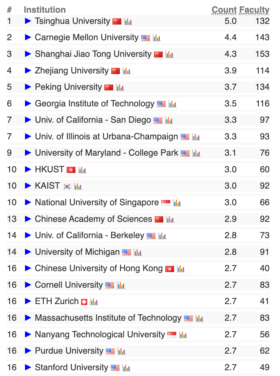 在此次更新的榜单上,清华大学首次摘得全球第一!清华大学、上海交通大学、浙江大学、北京大学分列第1、3、4、5位,直接占据了TOP 5中的4个名额。传统霸主卡内基梅隆大学(CMU)退居第2,但依然保持着美国高校的最高排位。亚洲势力整体上扬:新加坡国立大学、韩国科学技术院(KAIST)、香港科技大学等悉数闯入前20。爱丁堡大学成英国赛区黑马,超越牛津、剑桥,成为英国第一。