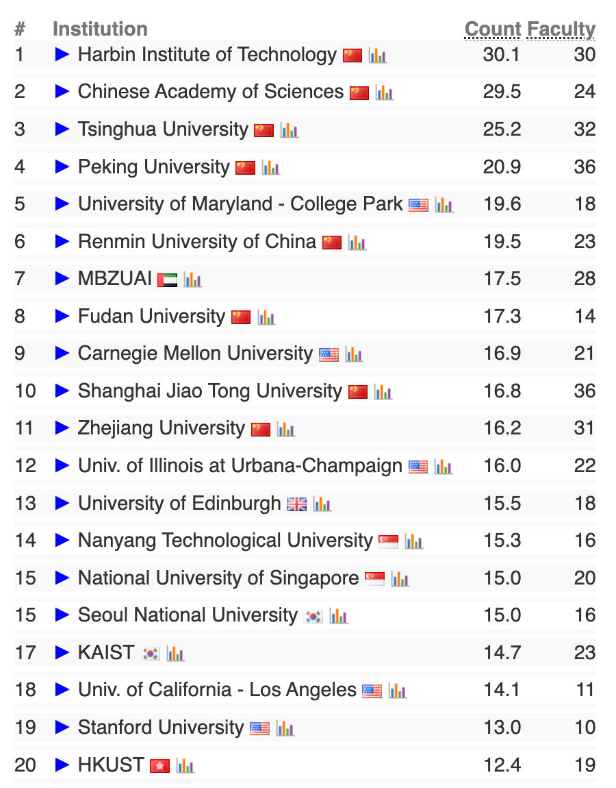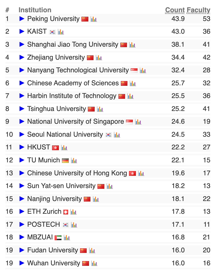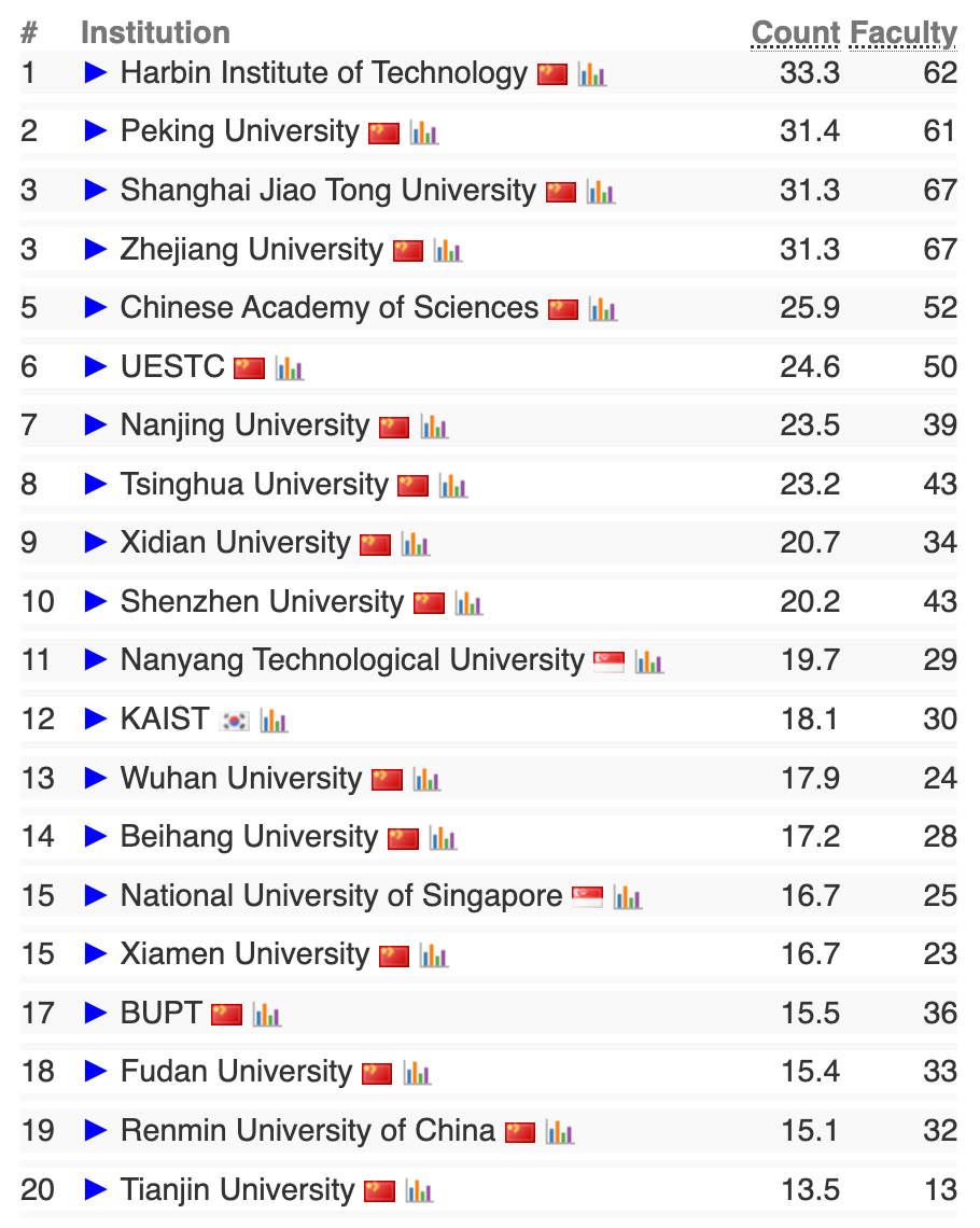 在此次更新的榜单上,清华大学首次摘得全球第一!清华大学、上海交通大学、浙江大学、北京大学分列第1、3、4、5位,直接占据了TOP 5中的4个名额。传统霸主卡内基梅隆大学(CMU)退居第2,但依然保持着美国高校的最高排位。亚洲势力整体上扬:新加坡国立大学、韩国科学技术院(KAIST)、香港科技大学等悉数闯入前20。爱丁堡大学成英国赛区黑马,超越牛津、剑桥,成为英国第一。