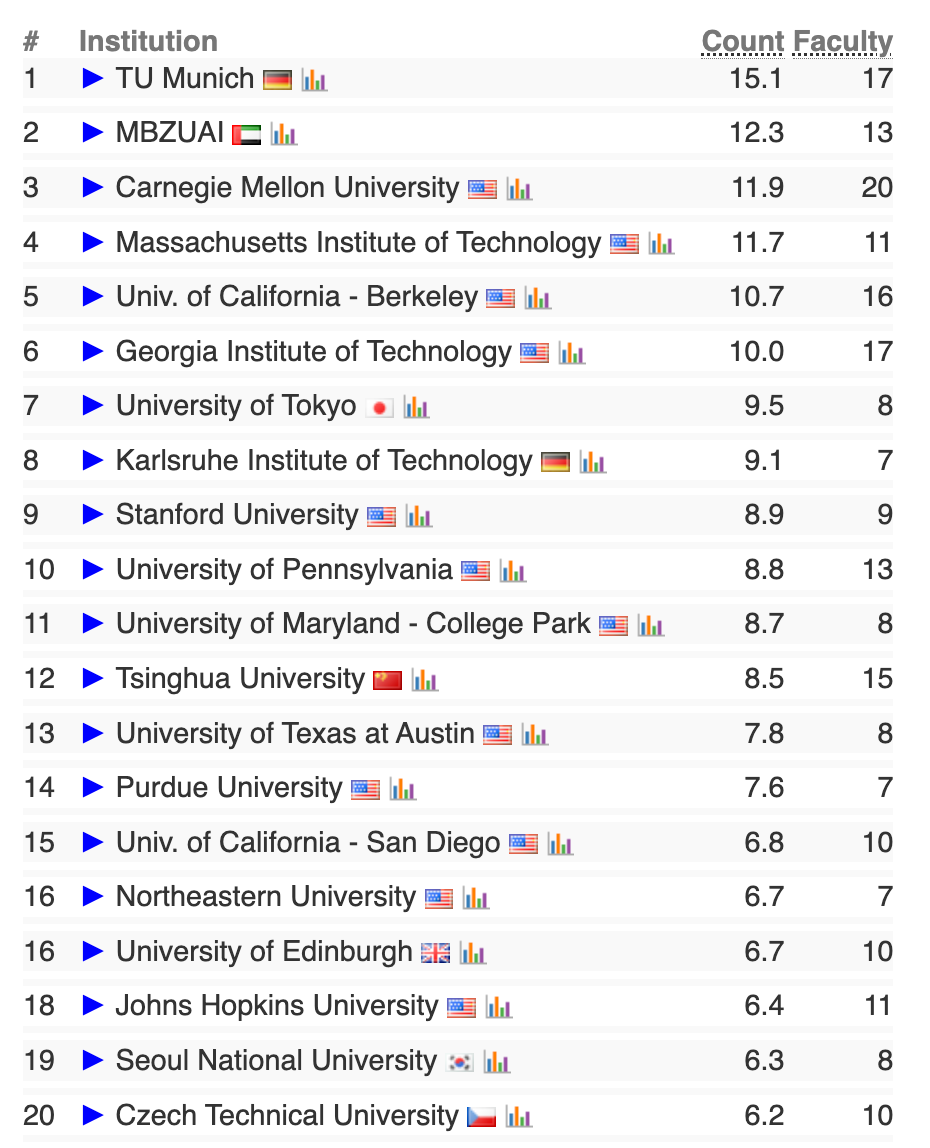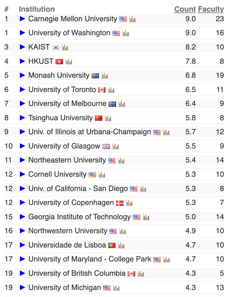 除了整体排名,CSRankings对众多热门细分方向也进行了排名。我们整理了人工智能、人机交互、机器人、软件工程等同学们较为关注和喜欢的专业方向。