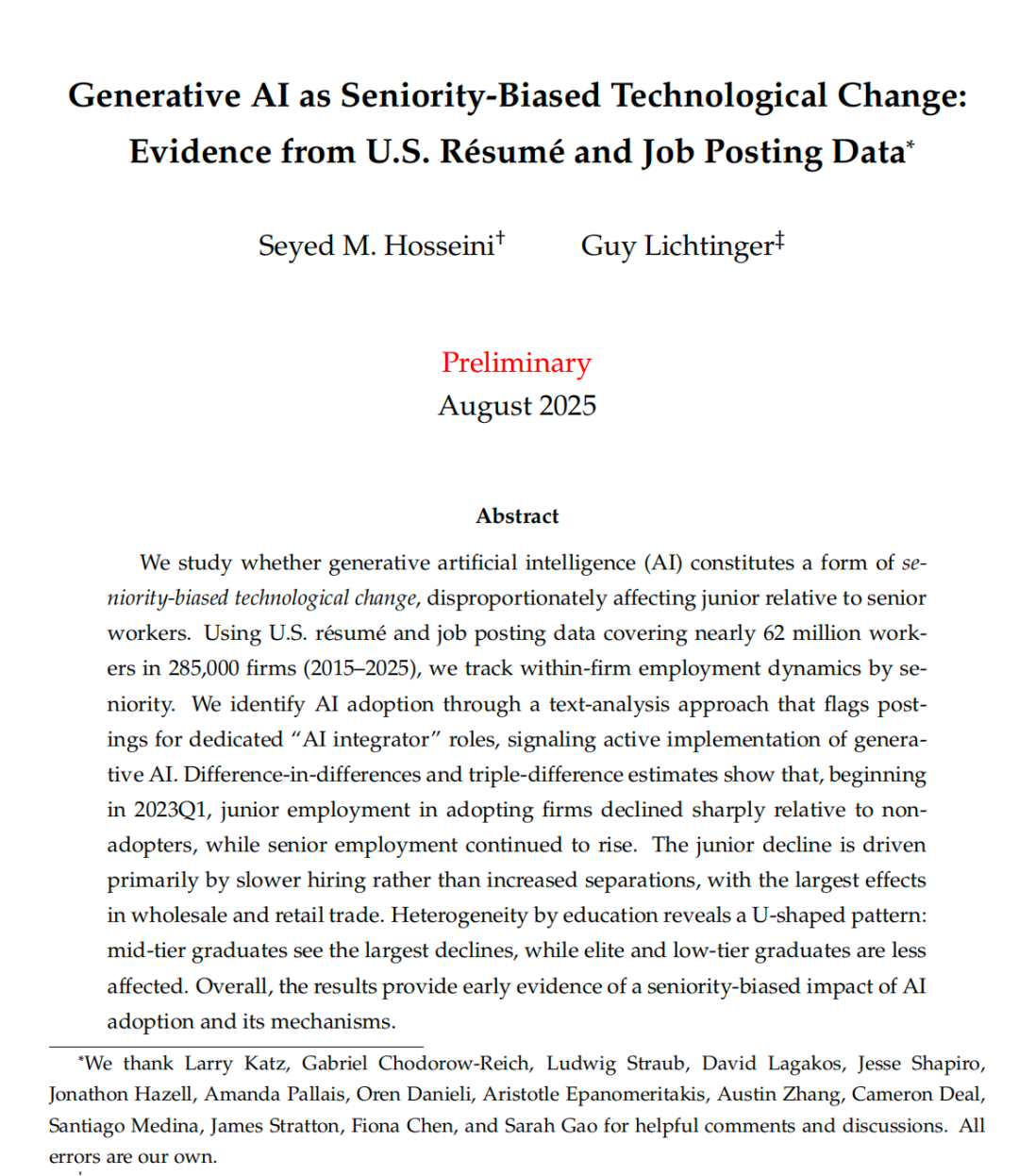 论文没有任何情绪渲染,就是用冰冷、庞大的真实数据,剖析了2023年以来美国就业市场的AI冲击具体是如何发生的——