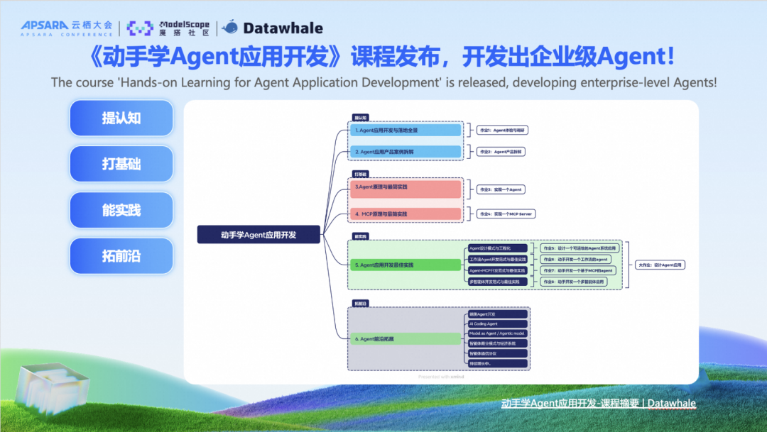 9 月 23 日,由 Datawhale 联合魔搭社区推出《动手学 Agent 应用开发》课程,于2025云栖大会正式发布。