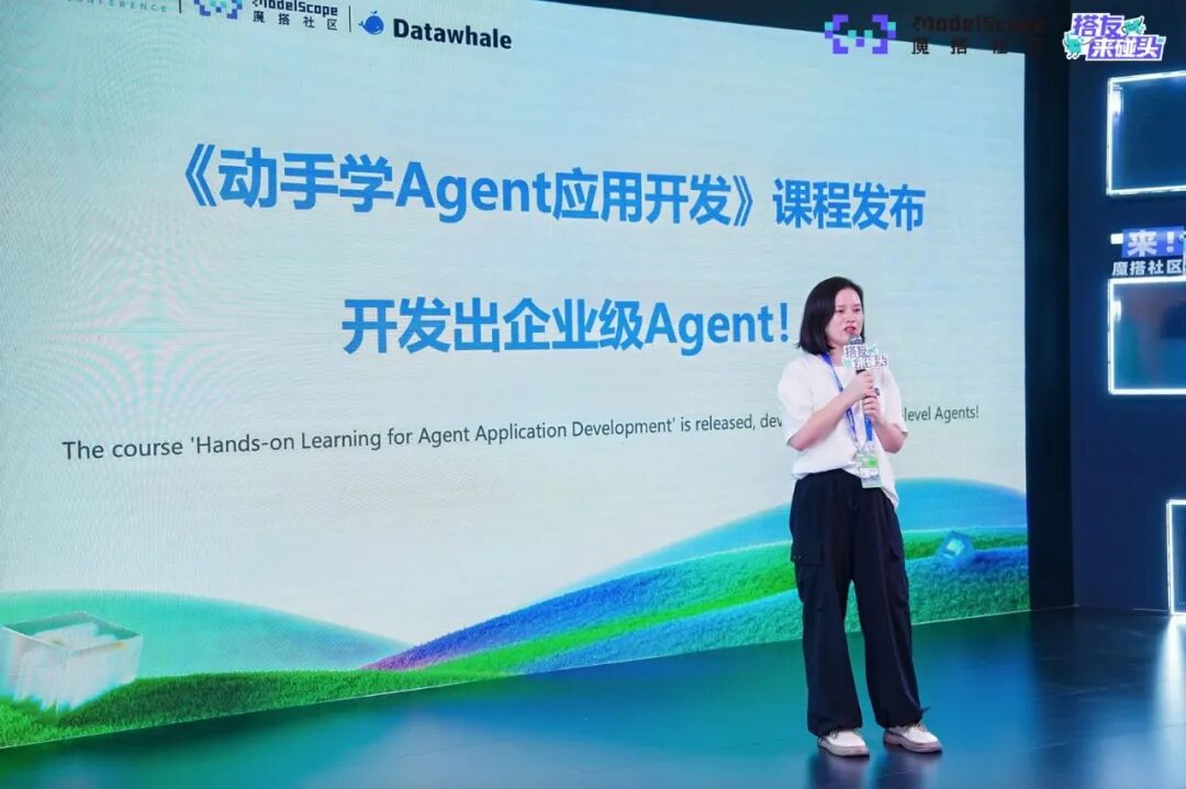 在发布仪式上,魔搭社区生态运营负责人有溪分享了联合打造《动手学 Agent 应用开发》课程的背景。她提到:“我们在魔搭常说一句话:正确的事情要坚持做、重复做。在过去三年里,我们与好伙伴 Datawhale 一直专注于一件事——打造 “学、练、赛” 体系。学,就是持续开发优质课程,从原理到实践;练,是结合开发者的实际需求,依托魔搭平台不断推出各种好用的工具和免费资源,例如 GPU、API 等,这是我们魔搭从平台维度提供练的能力;赛,则是像今天这样的活动,为开发者搭建舞台,以赛会友,互相切磋。在这个理念下,我们共同发布了这样一门全新的Agent课程,集结了我们三年来的经验与精华,并邀请各领域的开源贡献者共同打造。”