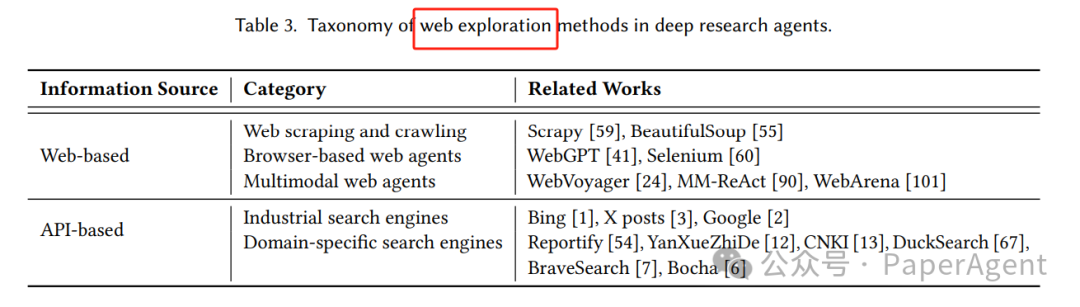 | Web Exploration | 主动调用搜索引擎、浏览网页、提取信息 | 如何过滤冗余、识别可信来源? |