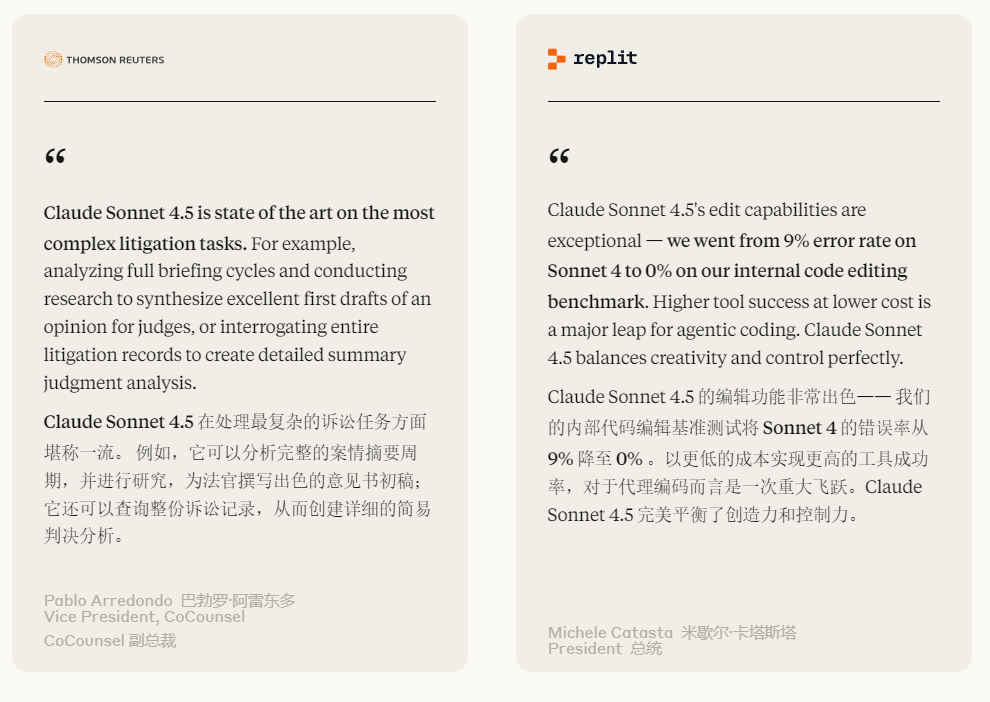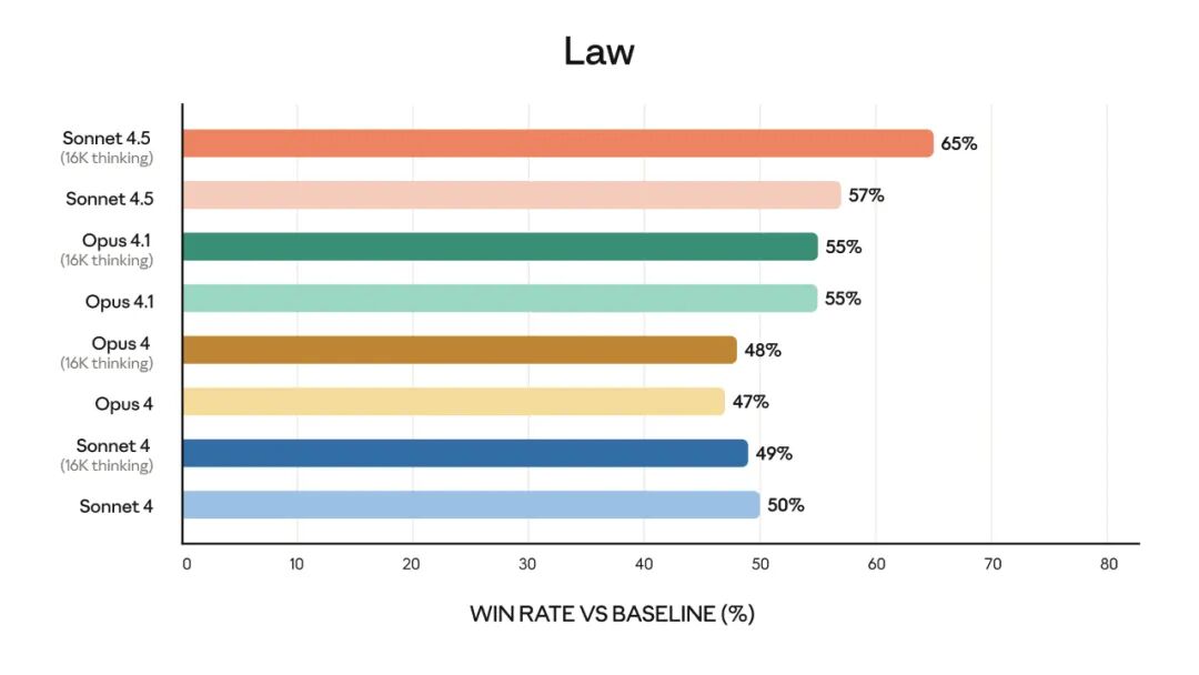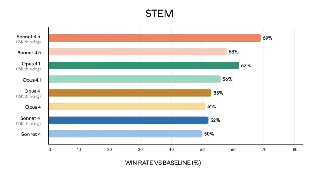 金融、法律、医学和理工科(STEM)领域的专家发现,与包括 Opus 4.1 在内的旧模型相比,Sonnet 4.5 在特定领域知识和推理方面表现得明显更好。