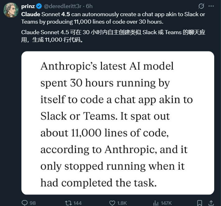 我们都知道,GPT-5 Codex 曾自称能独立运行超过 7 小时。但这次,Claude Sonnet 4.5 把自主编码时长提到了 30 多个小时。