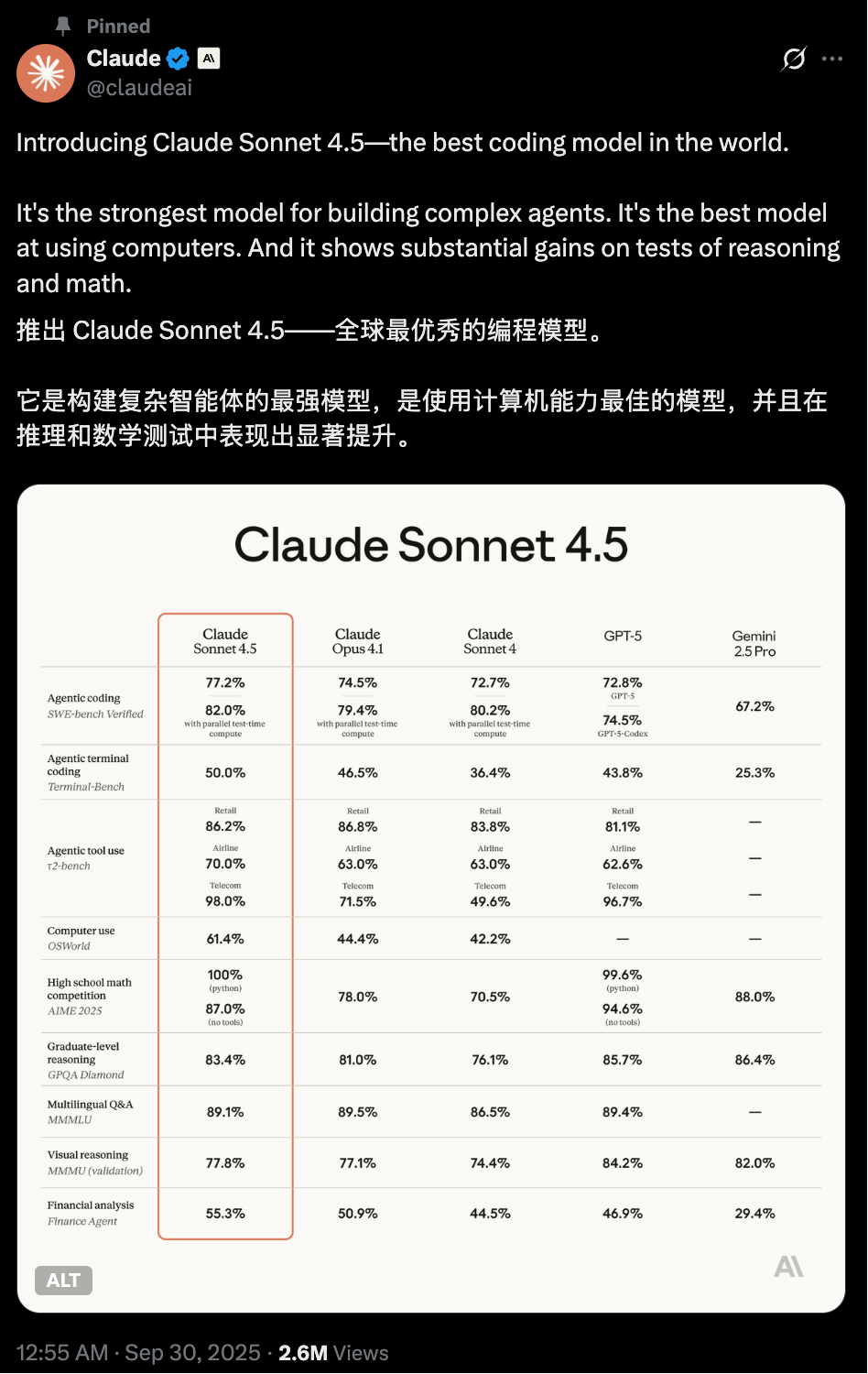 昨天,DeepSeek 开源新模型 V3.2-Exp,深夜 Anthropic 也不甘人后,重磅发布 Claude Sonnet 4.5。