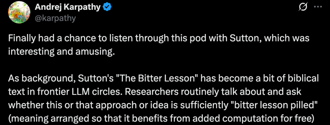 Andrej Karpathy首先点明了一个背景:Sutton的“苦涩教训”(The Bitter Lesson)一文,如今已成为前沿LLM圈子里的“圣经”。研究者们会经常讨论某个方法或想法是否足够“bitter lesson pilled”(意即一个方法能够随着算力的增加而自然受益),以此作为判断其是否有效或值得追求的依据