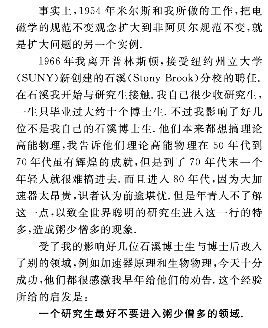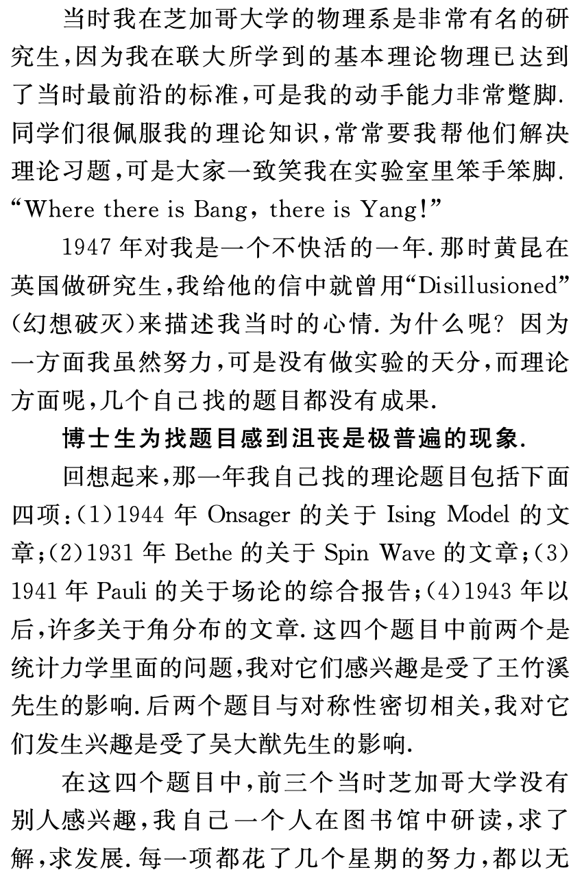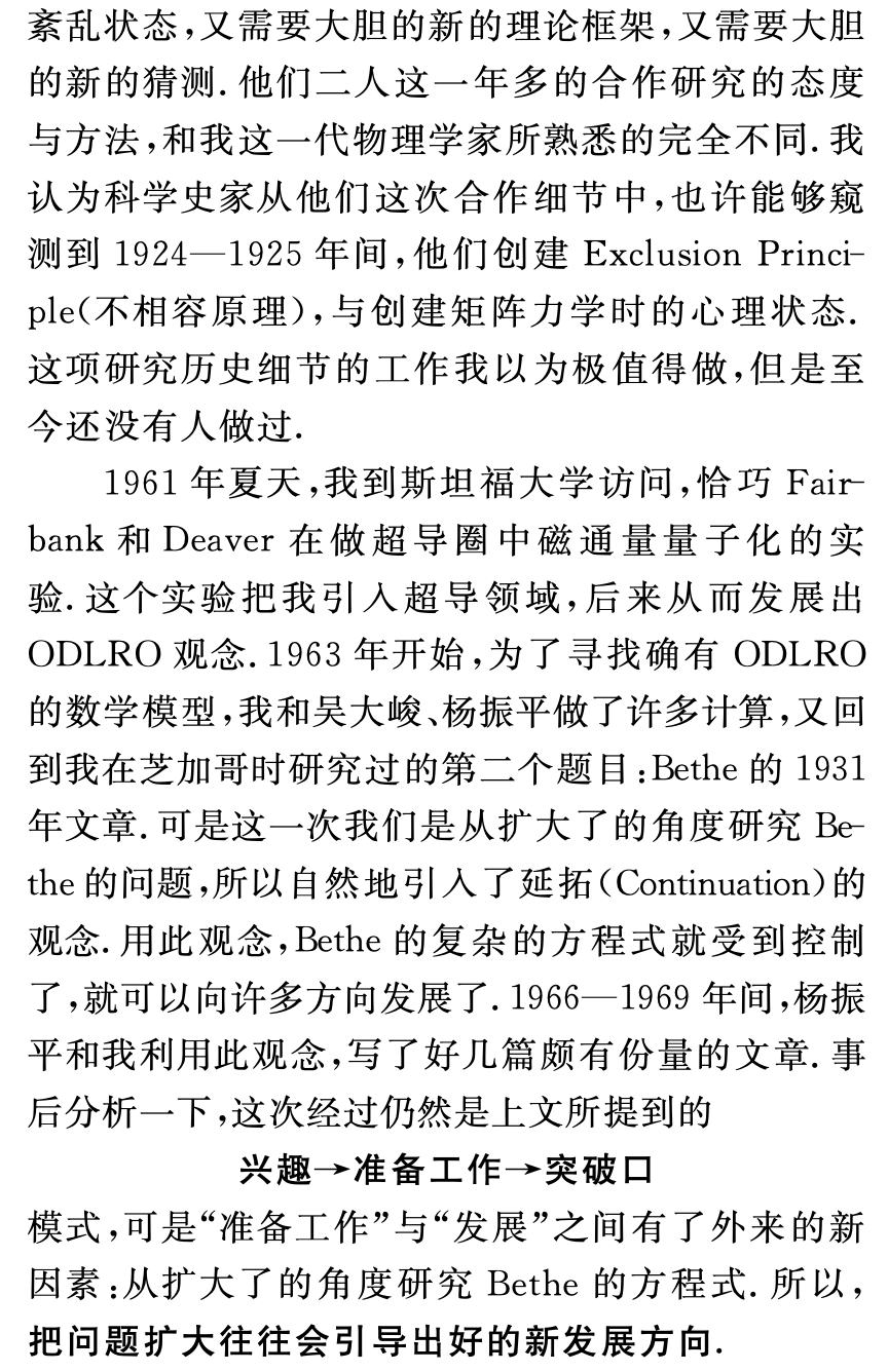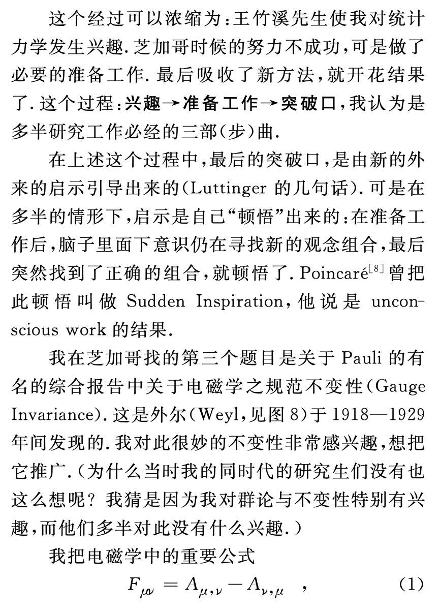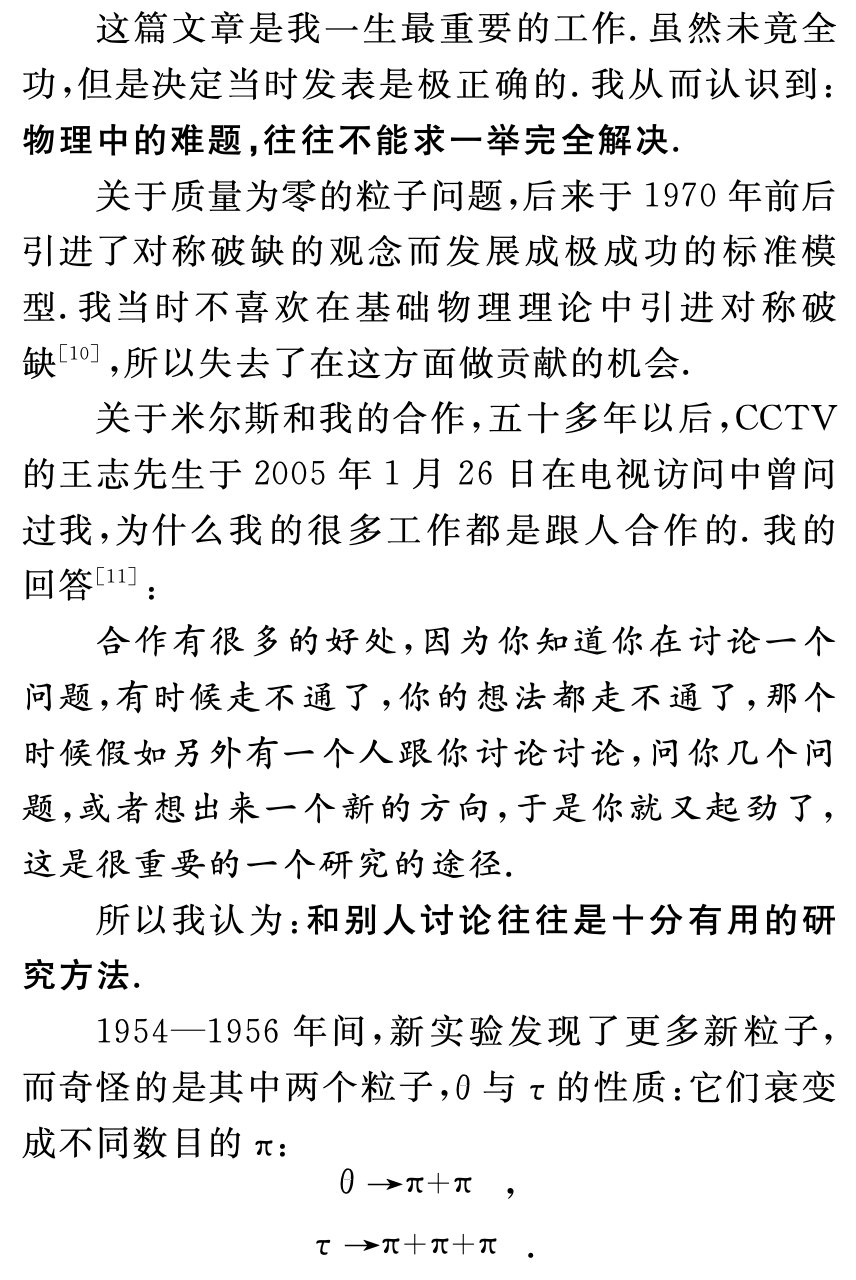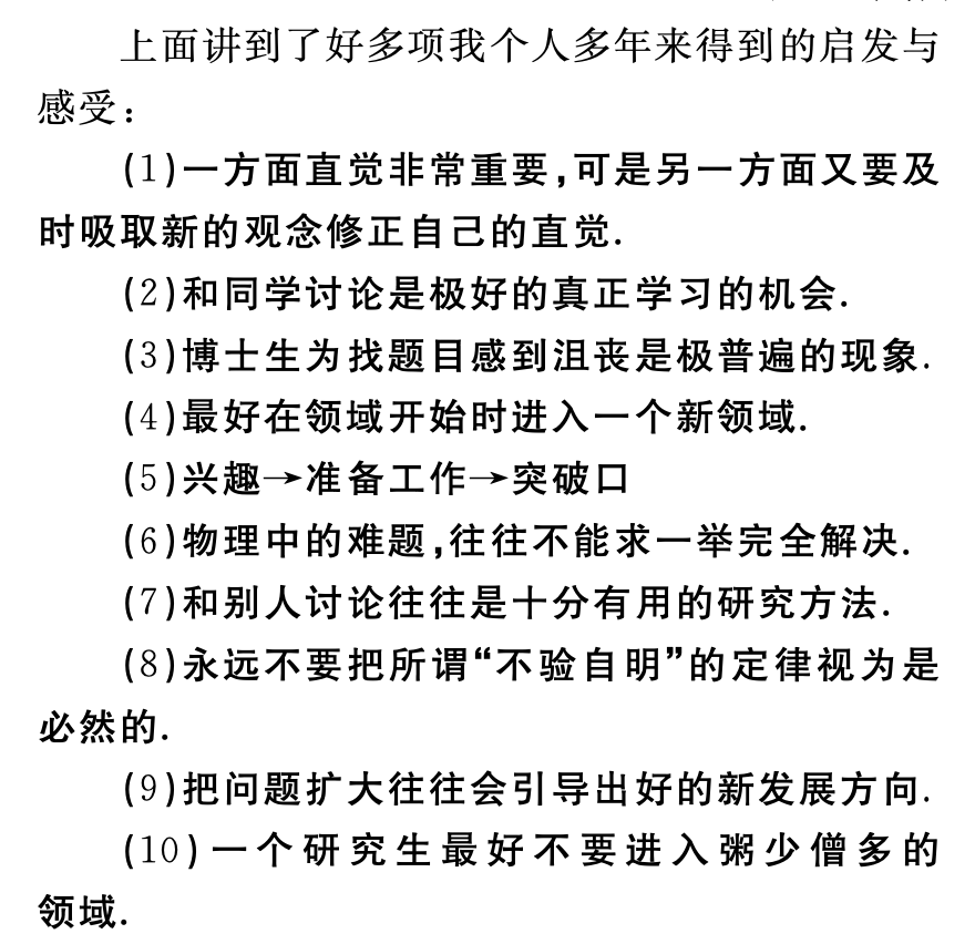 在发表于《物理》2012年第1期的《我的学习与研究经历》一文中,杨先生系统梳理并总结了他一生在科学探索中的诸多感悟与启发,包括十点珍贵体会:
