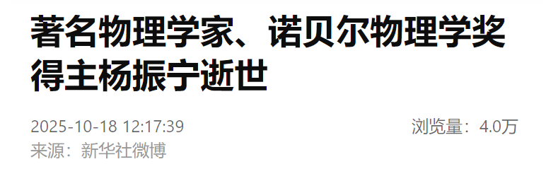 新华社消息,享誉世界的物理学家、诺贝尔物理学奖获得者,中国科学院院士,清华大学教授、清华大学高等研究院名誉院长杨振宁先生,因病于2025年10月18日在北京逝世,享年103岁。