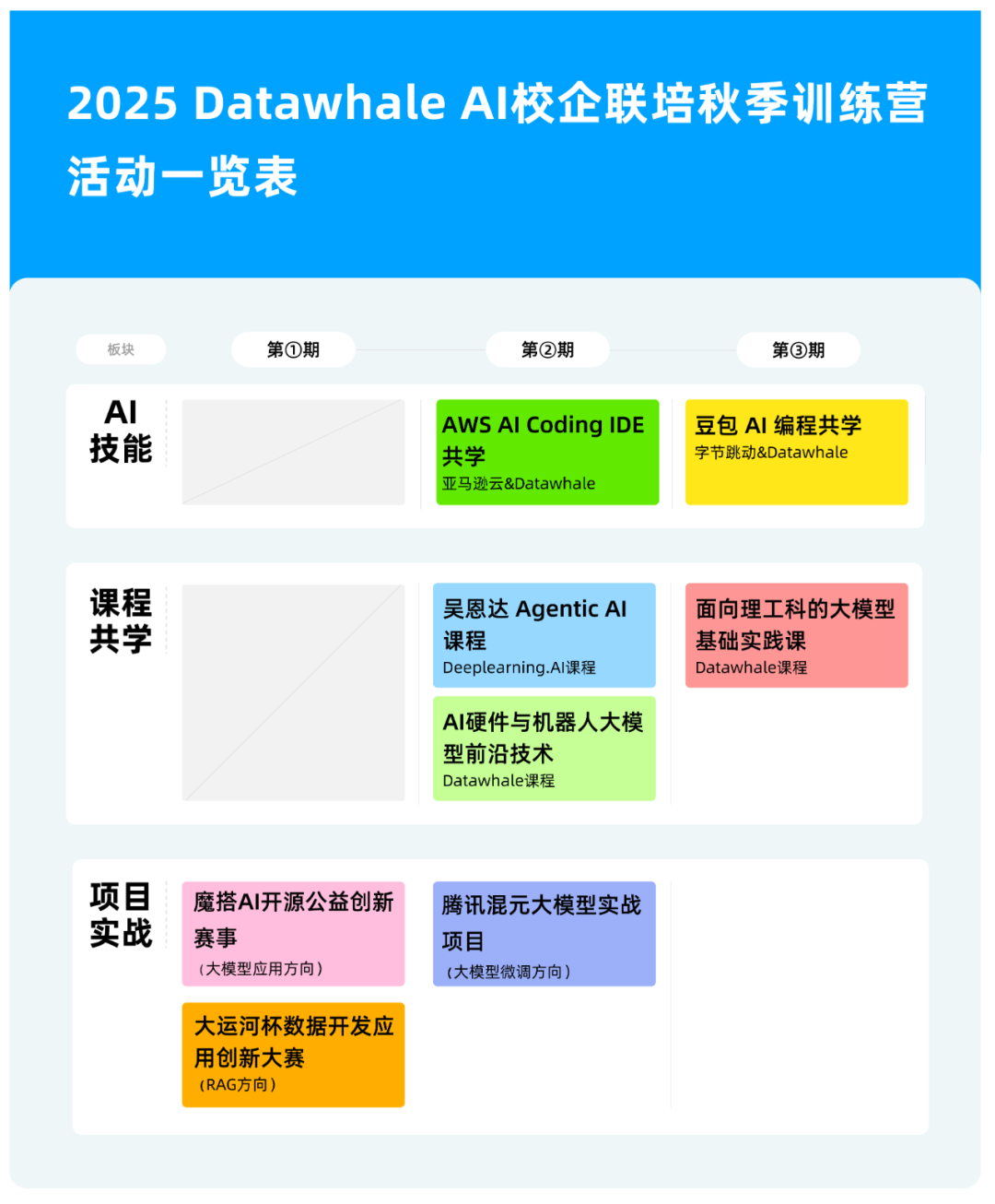 AI秋训营是Datawhale在秋季发起的大规模AI学习活动,旨在联合高校、企业资源和开源社区力量,为学习者提供项目实践和学习机会,提升他们的专业能力和就业竞争力。