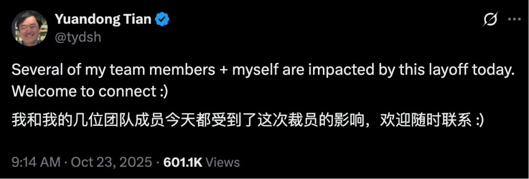 挺夸张的,这次裁员竟然包含了华人 AI 科学家田渊栋。他在 X 上发帖称,“今天,我和我的几位团队成员都受到了此次裁员的影响。欢迎联系我们 :)”