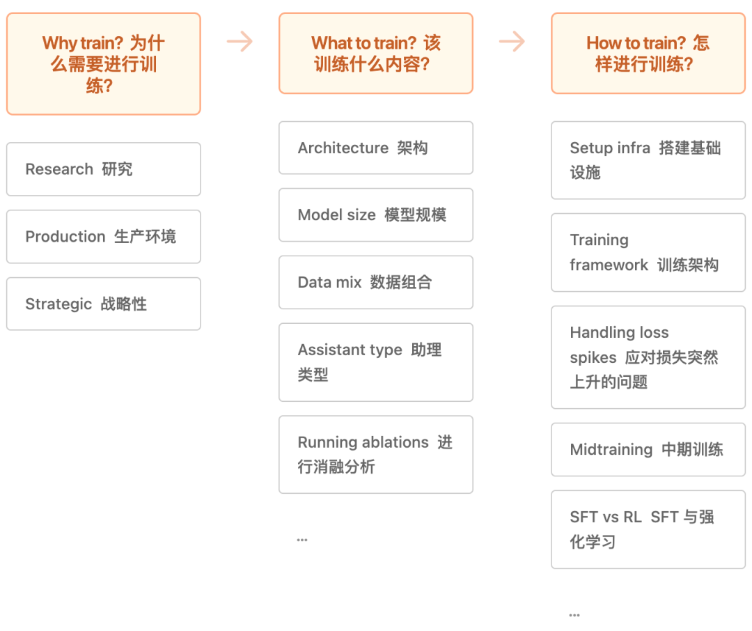 训练一个高性能的 LLM 是一个高风险项目,所以在训练之前一定要从战略层面回答三个核心问题:为什么训练(Why)、训练什么(What)和如何训练(How)。
