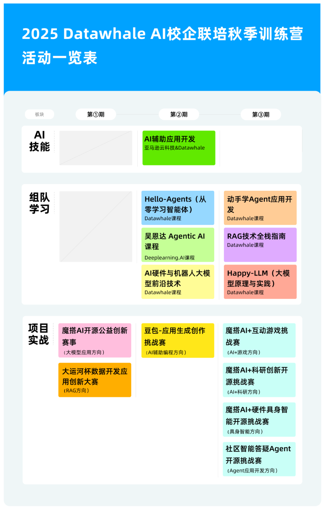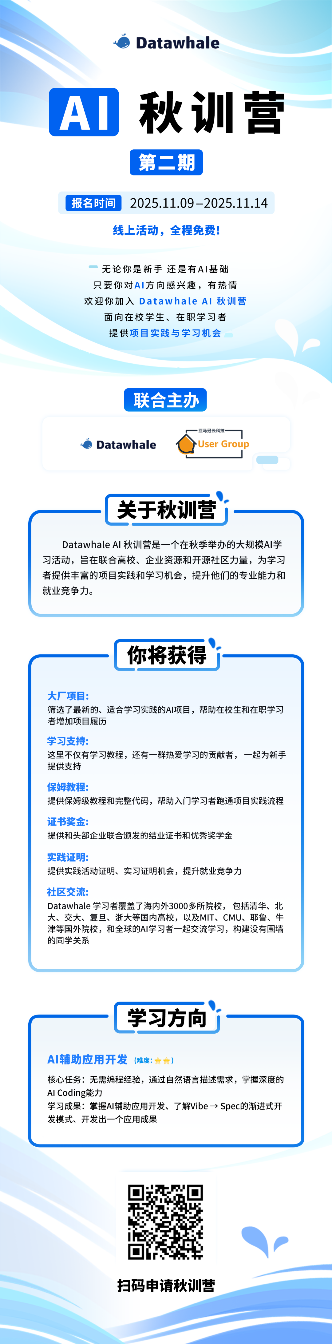 AI秋训营是Datawhale在秋季发起的大规模AI学习活动,旨在联合高校、企业资源和开源社区力量,为学习者提供项目实践和学习机会,提升他们的专业能力和就业竞争力。