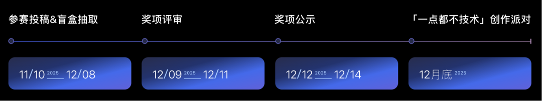 同时,参赛投稿还能有机会获得神秘盲盒,优胜选手将受邀参加「一点都不技术」创作派对与顶尖创作者、AI 专家、投资人、媒体交流。