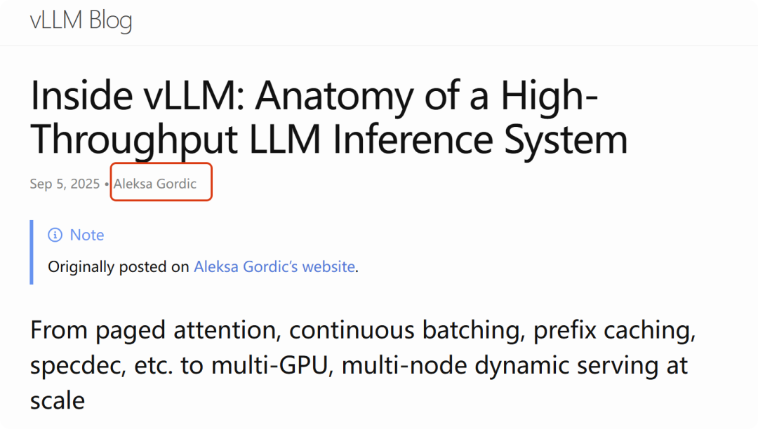 「备注:作者是前 Google DeepMind 和 Microsoft 的机器学习工程师 Aleksa Gordć,Aleksa 目前是 P-1 AI 联合创始人。GitHub 主页:https://github.com/gordicaleksa。这篇博客也被收录进了 vLLM 官方文档里:https://blog.vllm.ai/2025/09/05/anatomy-of-vllm.html」