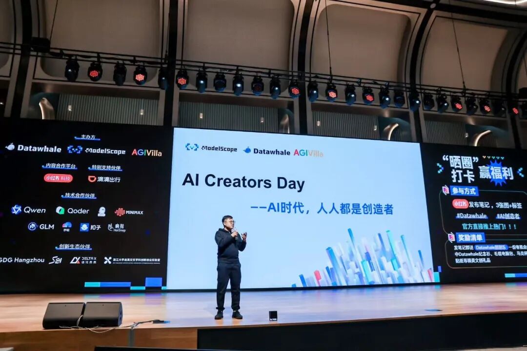 而将“开源社区”理念推向高潮的,是由Datawhale和魔搭社区、AGIVilla全程策划并落地的线下活动:AI Creators Day。该活动让没有编程基础的同学也能做出自己的AI作品,同时汇聚了14家头部技术合作伙伴、内容合作伙伴、创新生态伙伴等共同参与,在杭州主会场及北京、武汉、广州等全国八大城市同步展开,吸引近千人参与,成为大会期间人数规模最大的AI动手实践活动。