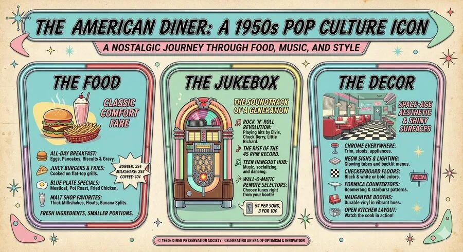 “制作一张复古的 1950 年代风格信息图,介绍美国餐馆的历史。包含明确分区:‘食物’、‘点唱机’和‘装饰’。确保所有文本清晰可读,并采用符合该年代的风格进行艺术化设计。”