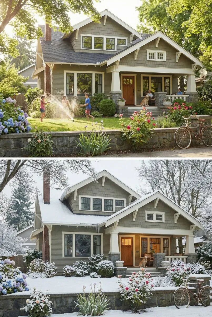 “把这个场景改为冬季。保持房屋建筑完全不变,但在屋顶和院子上添加积雪,并将光线改为寒冷、阴沉的下午光效。”