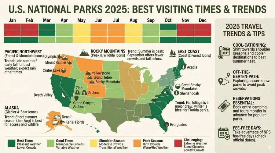 “根据当前旅行趋势,生成一张 2025 年前往美国国家公园最佳时间的 信息图。”