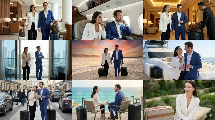 “创作一个引人入胜的 9 部分故事,包含 9 张图像,主题为一对男女出现在获奖的豪华行李箱广告中。故事应具有情感高潮与低谷,以一个展示女性和品牌标志的优雅镜头结束。男女的身份和服装必须在整个过程中保持一致,但可以且应该从不同的角度和距离展现他们。请一次生成一张图片。确保每张图片均为 16:9 横向格式。”