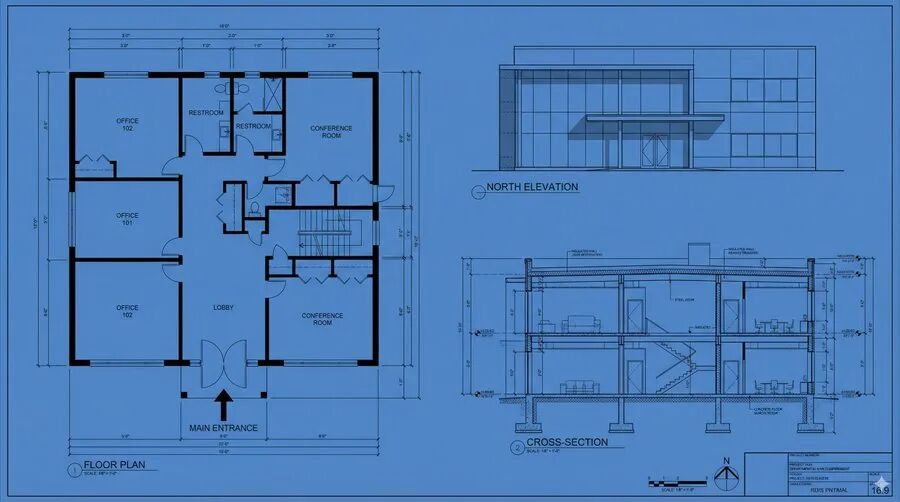 “创建一张正投影蓝图,从平面、立面和剖面描述这座建筑。用技术建筑字体清晰标注‘北立面’和‘主入口’。比例 16:9。”