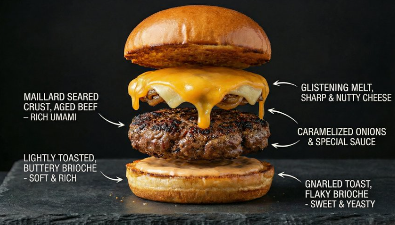 “创建一张超写实的信息图,展示一份精致芝士汉堡的分解图,突出烤制至金黄的布里欧修面包的纹理、肉饼的煎烤外壳以及芝士闪亮的融化状态。为每一层标注其风味特征。”