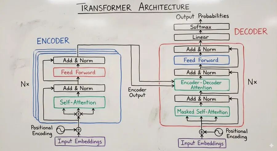“将‘Transformer 神经网络架构’的概念概括成适合大学讲座的手绘白板图示。使用不同颜色的记号笔区分编码器(Encoder)和解码器(Decoder)模块,并为‘自注意力(Self-Attention)’和‘前馈网络(Feed Forward)’标注清晰的标签。”