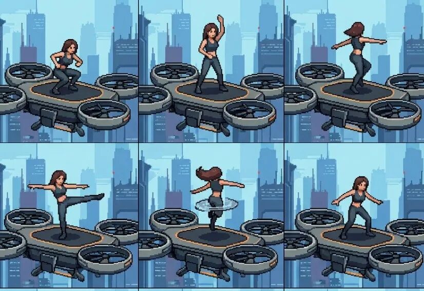 “在无人机上做后空翻的女性精灵图,3x3 网格,序列,逐帧动画,正方形纵横比。严格按照所附参考图像的结构。”