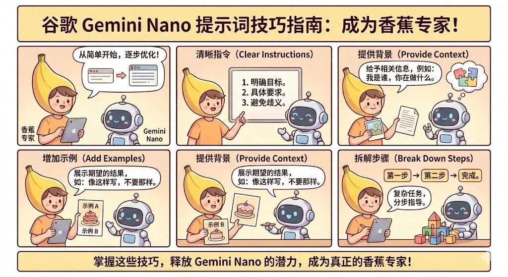 提示词:(@LufzzLiz)blog.google/products/gemini/prompting-tips-nano-banana-pro/用图片总结如上文章,图片文字用中文,详细一点,图片美观一些,漫画风格