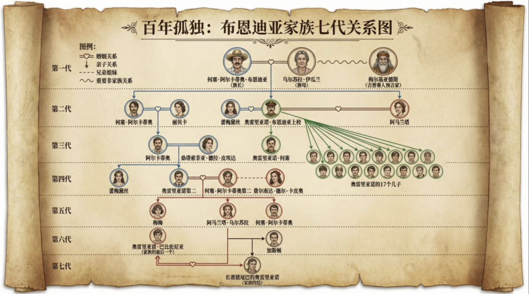 提示词(@canghecode,公众号:苍何)画出《百年孤独》中的重要人物关系图,用中文表示关系