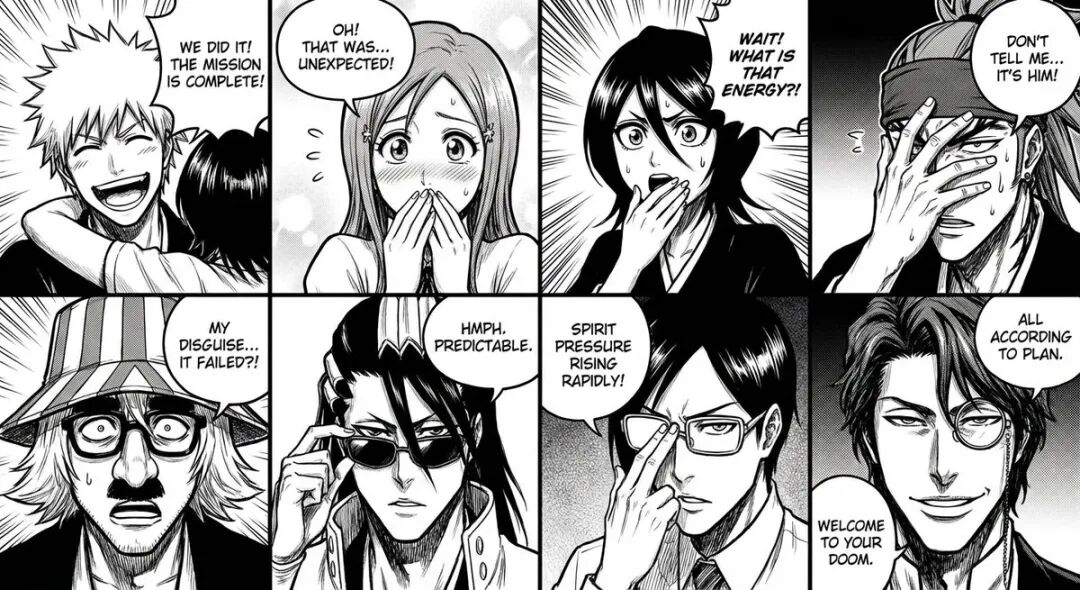 提示词:(@Gdgtify)Step 1: 选择任意 8 个表情符号Step 2: 将这些内容绘制成 8 格的《死神》风格漫画。在漫画中加入对话气泡,并创作一个引人入胜、充满动作的故事情节。输出:一页风格化的漫画