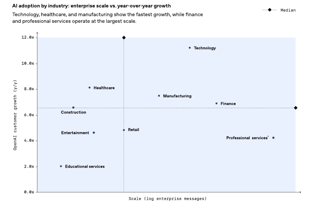 API 最常用于构建和扩展面向客户的应用(如产品内助手、搜索和自动化),尤其是科技公司。但使用正在多样化:客户服务和内容生成现在约占 API 活动的 20%,非科技企业的 API 使用同比增长 5 倍。总体而言,这一模式表明采纳正在扩展,超越技术主导的产品嵌入,向更广泛的运营和工作流部署发展。