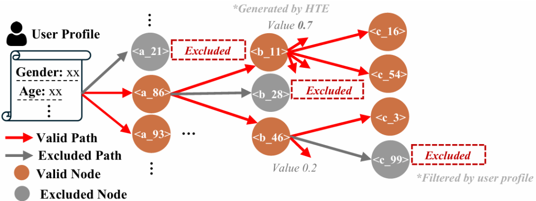 在束搜索过程中,这棵树不仅提供剪枝约束,还与HTE模块的价值预测深度结合。当模型生成到语义ID的某一层级时,系统会参考该节点下所有子节点的预估价值,动态调整束搜索宽度,价值越高的分支获得越多的探索机会。
