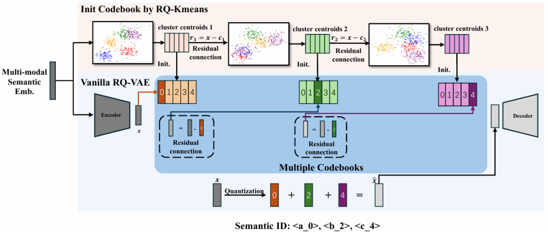 这个算法缓解了传统方法的“码本坍塌”问题。具体地,先用传统的RQ-Kmeans获得一个高质量初始码本,再基于此进行可微分的量化训练。这种方法的精妙之处在于平衡了码本质量与训练稳定性,纯聚类方法能获得分布均匀的码本但无法端到端优化,纯梯度方法容易坍塌但有更好的表示能力。最终将码本利用率提升至99.36%,语义一致性达到99.2%。这些结果表明,被 RQ-KMeans+ 归入同一语义ID下的项目更有可能属于相同类别且具有更高的相似性,从而产生了更合理的代码碰撞。