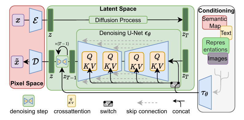 你可以清晰的在上面的原理图中看到,左侧红色区域代表原本的像素空间,输入和输出的图像都在这个空间当中;而中间复杂的处理过程,都在绿色区域所代表的潜空间中进行的。