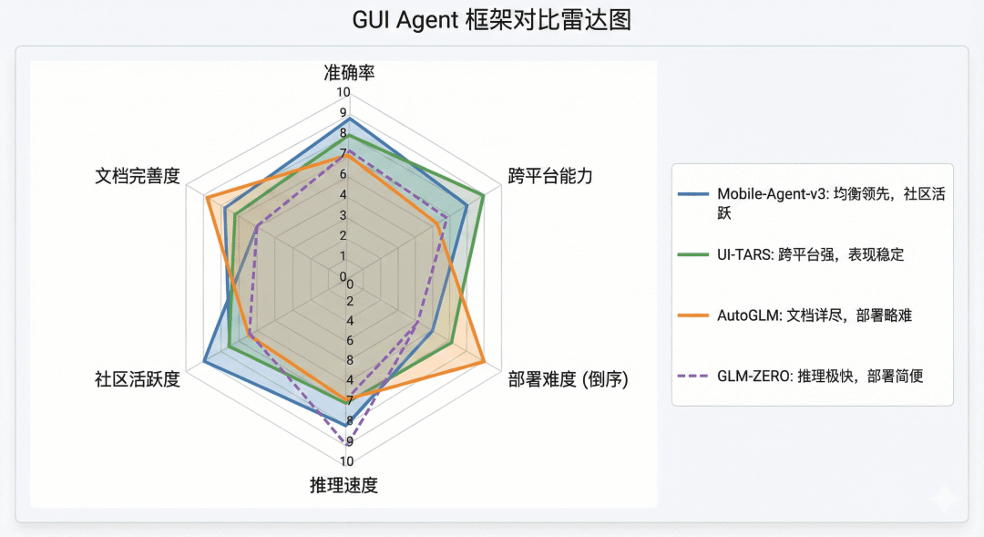 图 2 主流 GUI Agent 框架全景对比雷达图